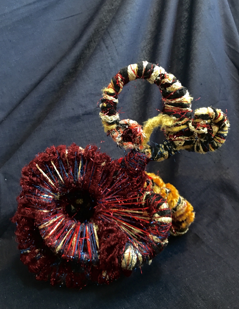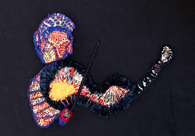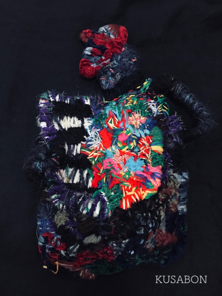 | 601 | 未来を奏でる 「トランペッター 」(最終日まで展示)*wall hanging | 針金、はぎれ、毛糸、刺繍糸、リリアン糸、ボタン | 縦25×横41cm×厚さ2cm | 1 |