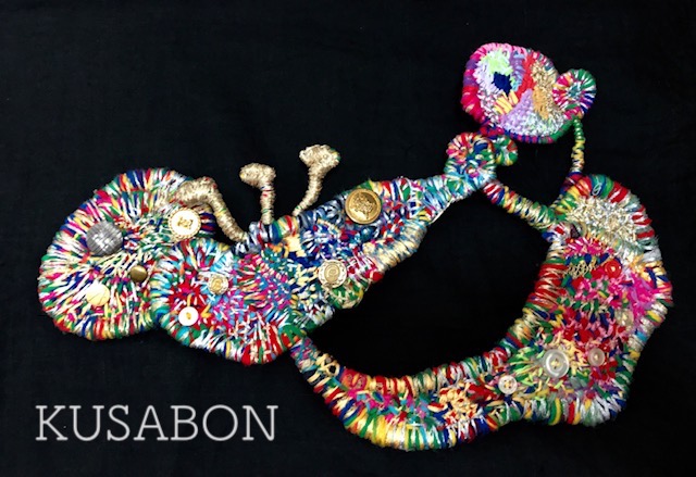 | 602 | 未来を奏でる「ギターリスト」(最終日まで展示)*wall hanging | 針金、はぎれ、毛糸、刺繍糸、リリアン糸、ボタン | 縦25×横38cm厚さ2.5cm | 1 |